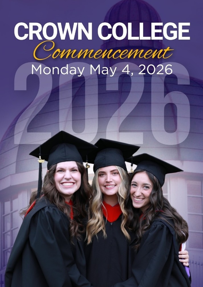 We are grateful for over 5,000 Crown College graduates who are serving the Lord across the world and are excited for the 2026 graduating class to join them! Join us as we celebrate our graduates at our Baccalaureate service on Sunday, May 3 at 6:00 p.m., followed by our Commencement Exercises on Monday, May 4 at 7:00 p.m. in the Temple Baptist Church auditorium. Both services will be livestreamed on our social media platforms.