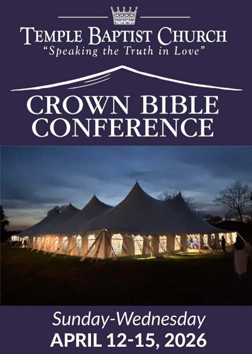Join us Sunday – Wednesday, April 12-15, 2026, in a revival tent on the grounds of the Temple Baptist Church. There will be great singing and Bible-preaching each day. If you are an alumnus of The Crown College, plan to be with us for a special meeting on Tuesday (click here to RSVP for the Alumni Banquet). Pray that God will do something truly special and long-lasting in this meeting.